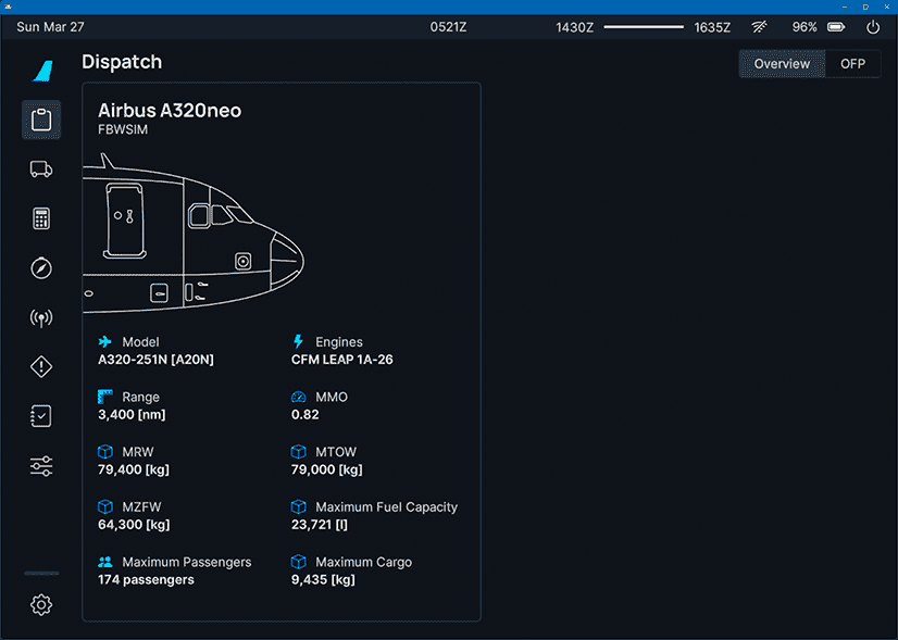 The OFP (Operational Flight Plan) will be displayed on this page after importing it with the button on the Dashboard page.