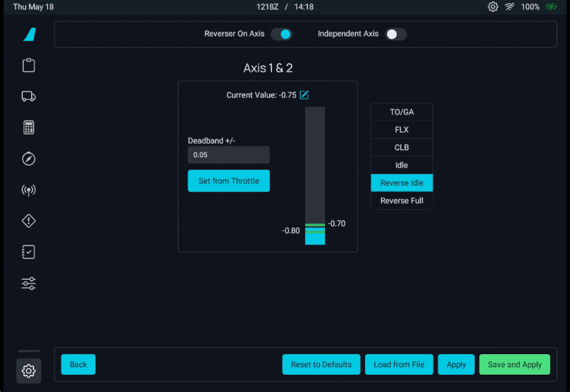• The throttle in the cockpit should move to IDLE or FULL REVERSE when you set your controller to the lowest possible setting.