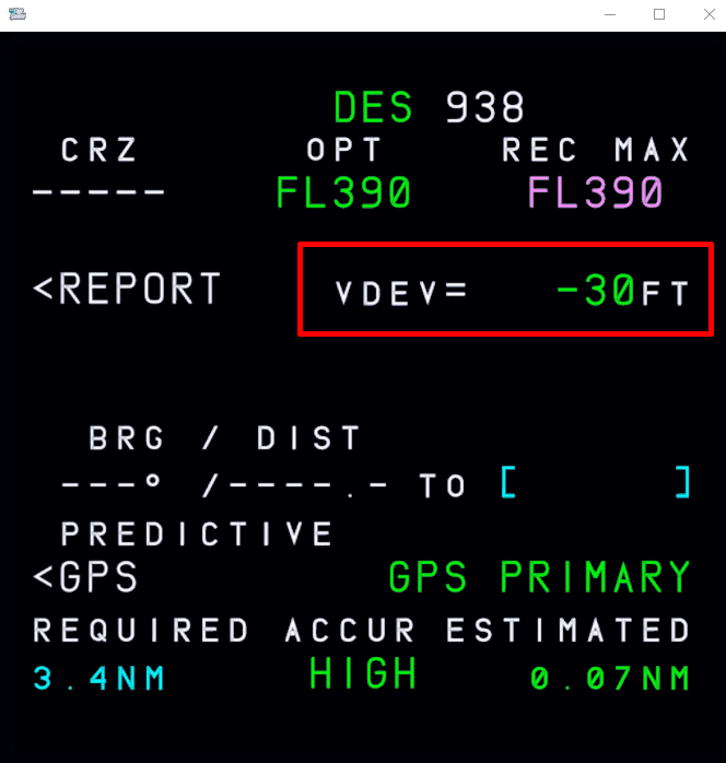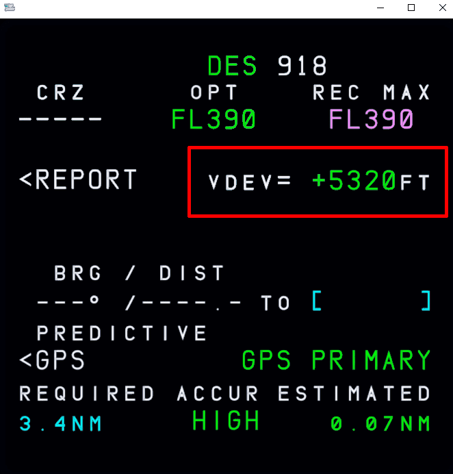 When the aircraft is descending, you can take note of the vertical deviation against the predicted descent profile on the PROG page of the MCDU. Alongside other indicators on the PFD, the PROG page provides a numerical value in feet. See the following two examples: