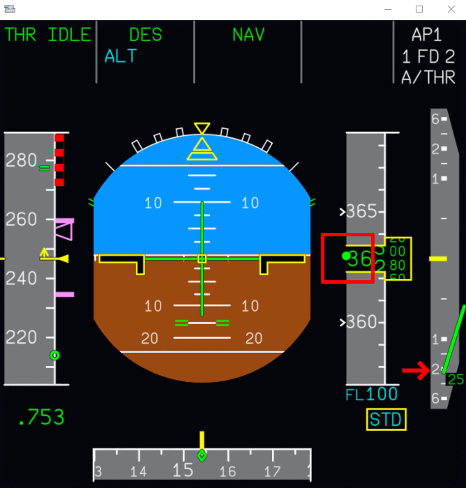 2. The V/DEV or "yoyo" indicator. It provides a visual indicator of how far below the descent profile from the command altitude (FL100). In this case, you will notice the aircraft is far below the profile, in part due to starting the descent early.