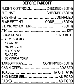 The "Before Takeoff" checklist is divided into two parts: