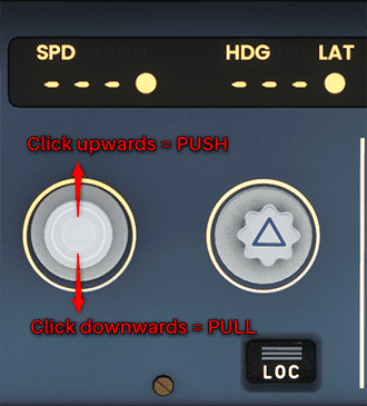 In Microsoft Flight Simulator, pushing is clicking the knob "UP" and pulling is clicking the knob "DOWN"