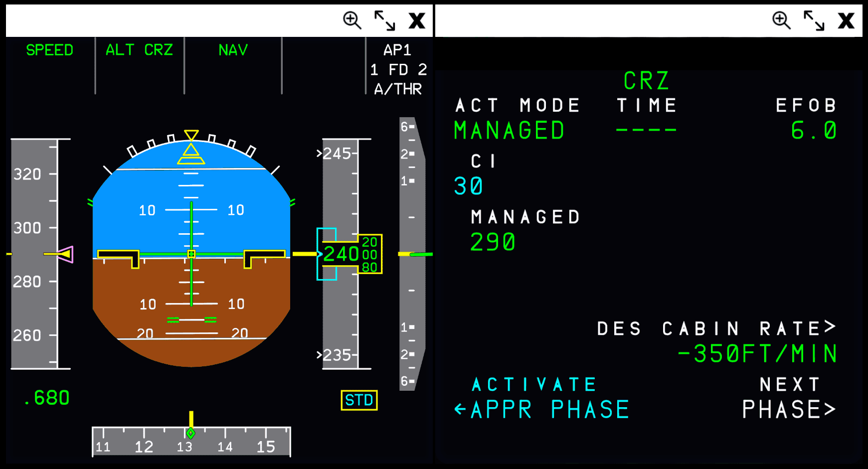 The A320 uses flight phases to manage different parts of a flight. These are preflight, takeoff, climb, cruise, descent, approach, go around, done. They match the PERF pages in the MCDU (see Preparing the MCDU).