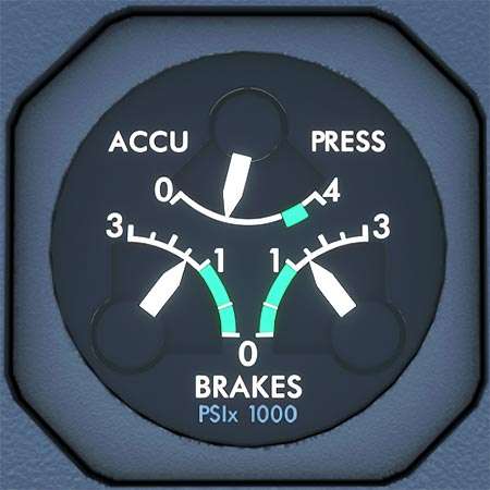 Accumulator Pressure Indication Back to Flight Deck Description ACCU PRESS: Pressure in the yellow hydraulic system brake accumulator. BRAKES: Yellow hydraulic system pressure delivered to the brakes. Measured downstream of the Direct Drive Valves. Back to Flight Deck