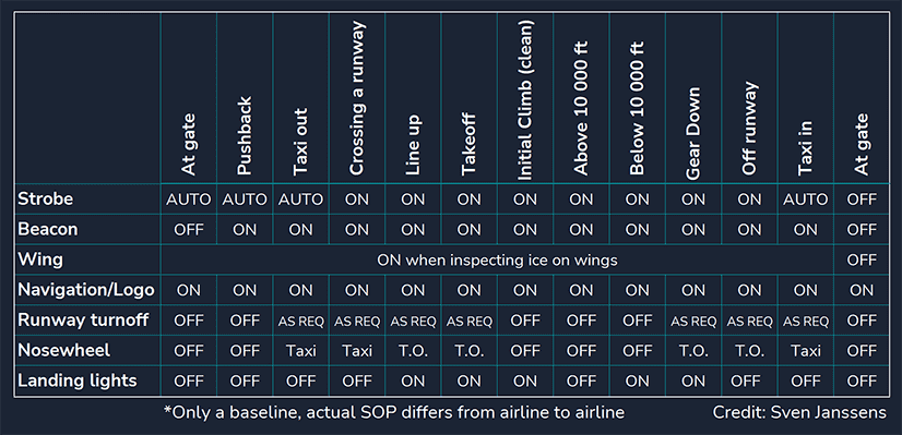 • Taxi and takeoff lights off.