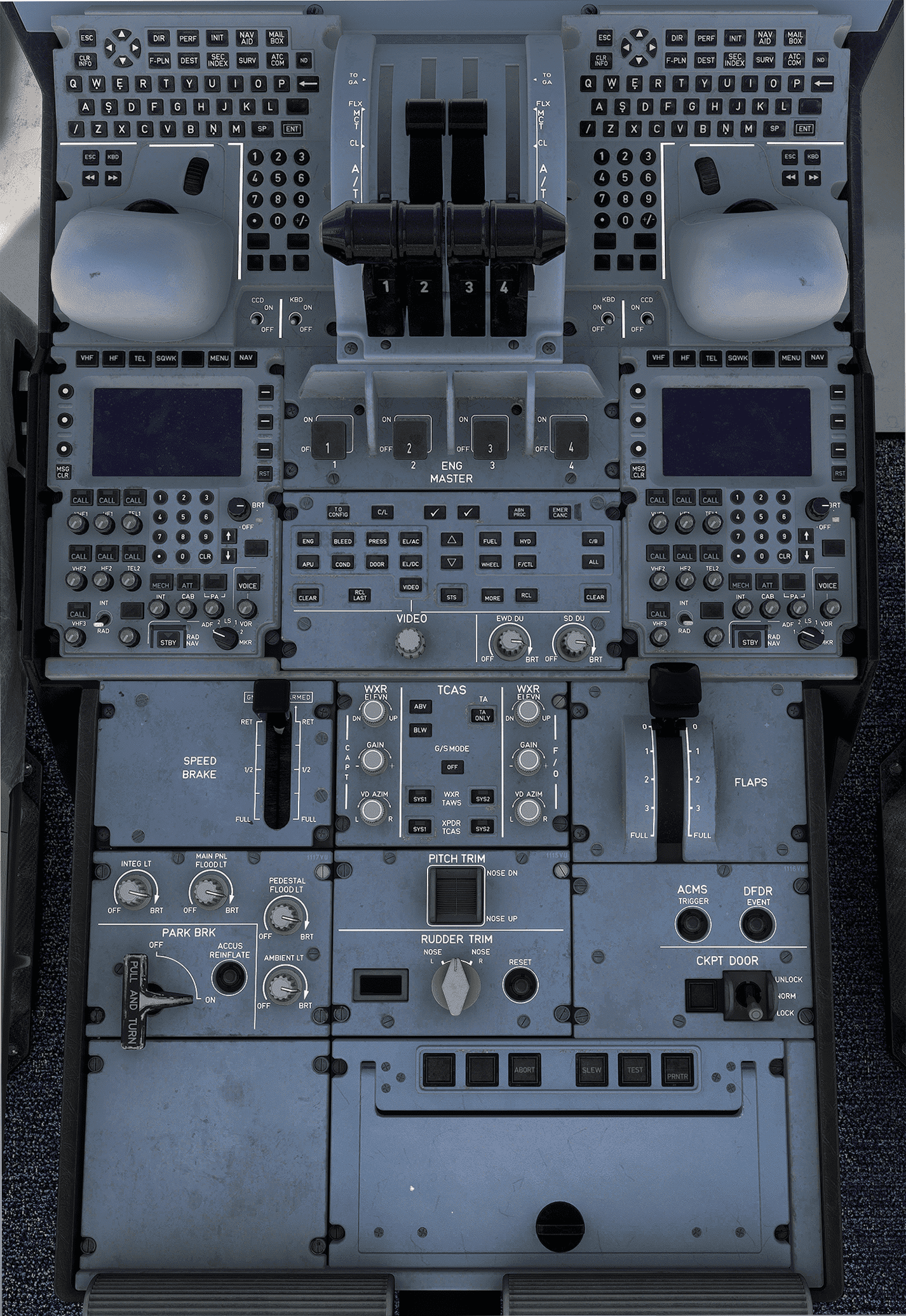 Pedestal Back to A380 Flight Deck Overview Thrust Controls KCCU Capt KCCU FO RMP Capt RMP FO Engine Master ECAM Control Speed Brake Flap Lever Surveillance Control Cockpit Lighting Parking Brake Trim Panel FDRS Cockpit Door Panel Printer Back to A380 Pilot Briefing Overview