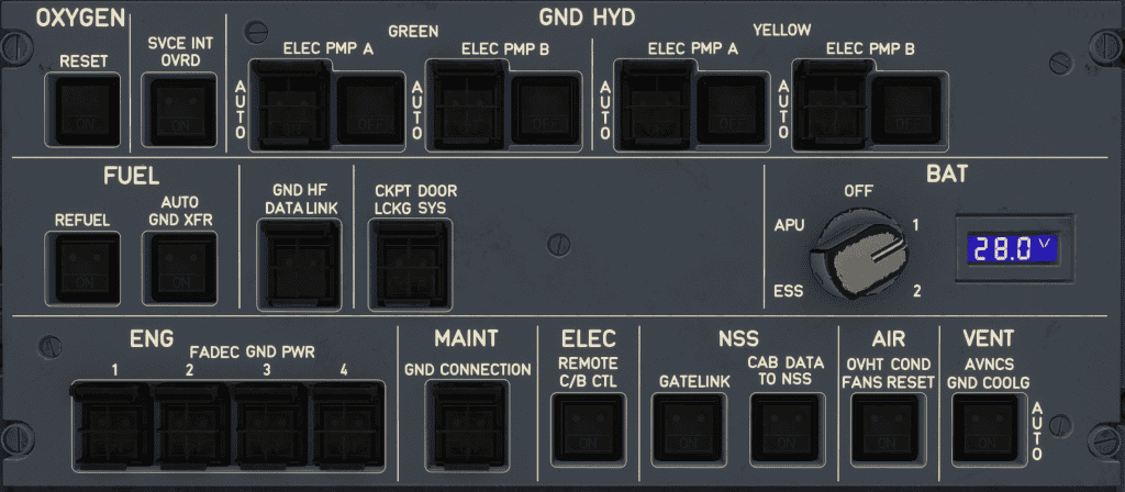 The Airbus A380 overhead maintenance panel provides a central interface for accessing various aircraft systems and performing maintenance checks. The panel is divided into sections, each dedicated to specific systems or functions.